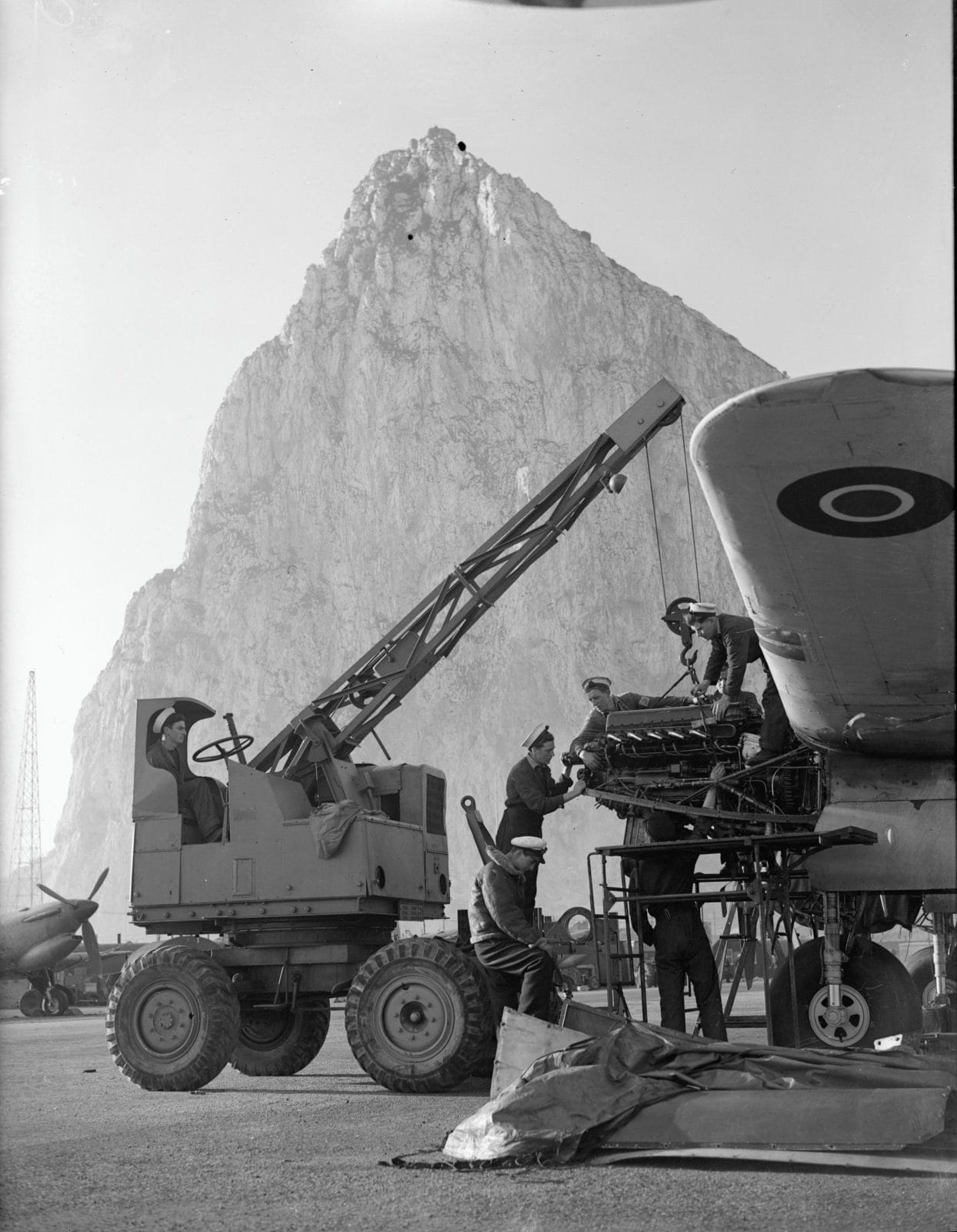 A group of Fleet Air Arm air mechanics putting a newly over-hauled engine into a Bristol Beaufighter on Gibraltar’s runway